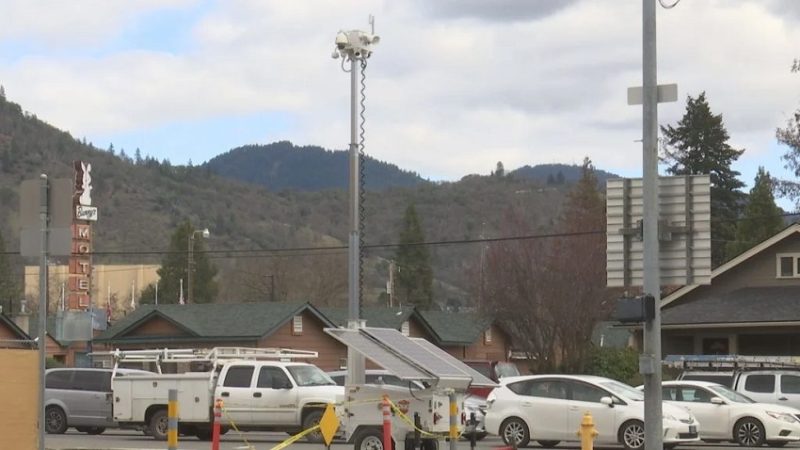GRANTS PASS, Ore. — A new mobile surveillance trailer, equipped with cameras and a loudspeaker, has been deployed at one of the city’s three designated camping sites for unhoused residents. The trailer, positioned at the corner of NW 6 and A Street, directly across from City Hall, aims to monitor the area, but its presence has raised concerns among those living at the site.
