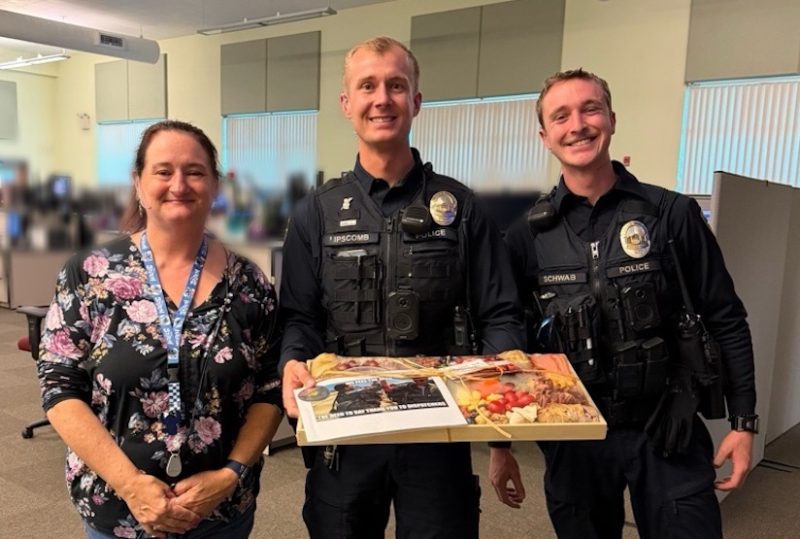 In a show of appreciation, patrol officers and records specialists visited Emergency Communications of Southern Oregon with a charcuterie board and handwritten notes, thanking dispatchers for their continued service.